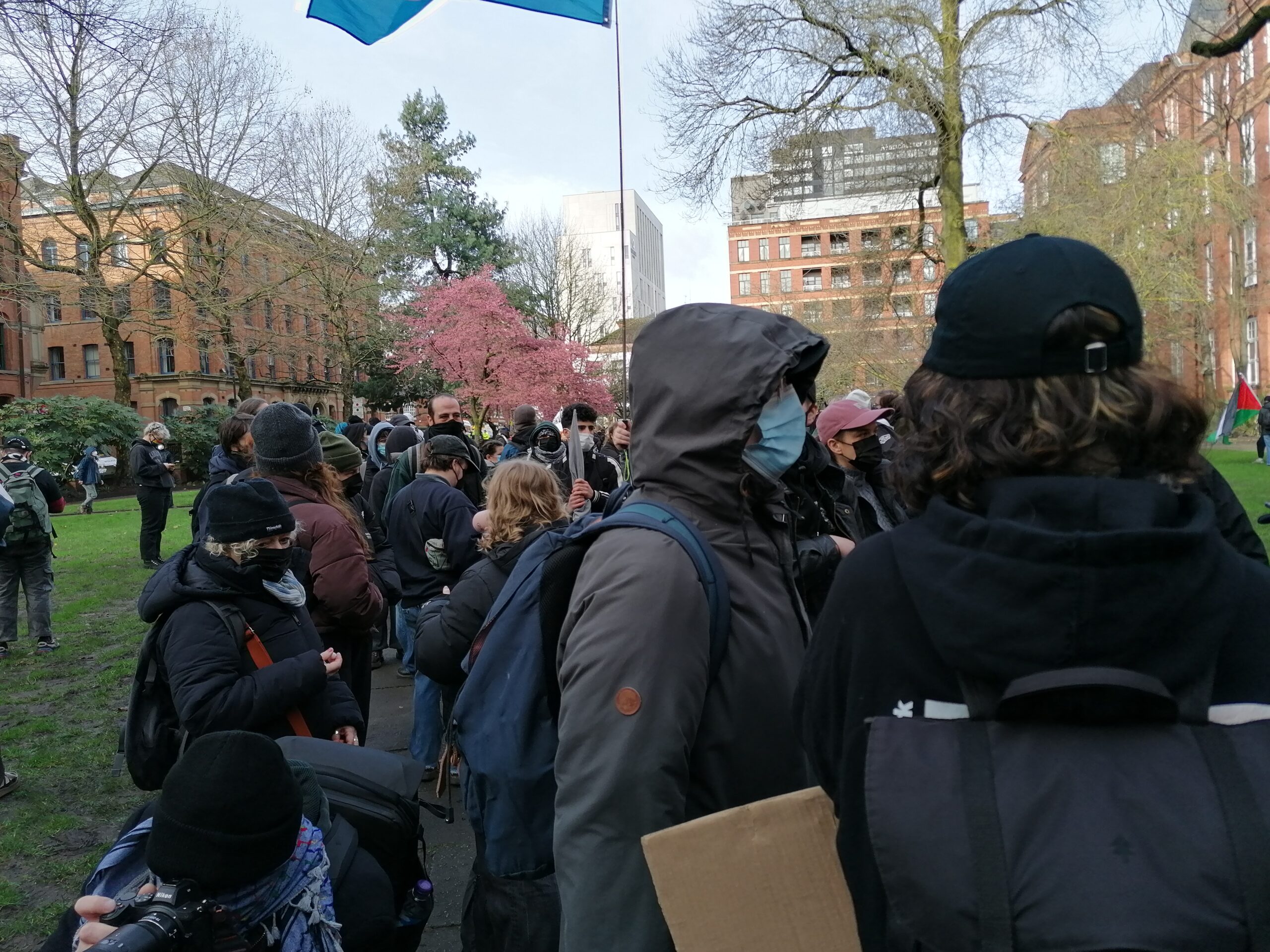 A shock in St Peter’s Square in Manchester as about 250 stop the war protesters were confronted by about a 100 Israeli, American and Shah of Iran supporters. There were chants of, U, U, USA as an American flag flew.