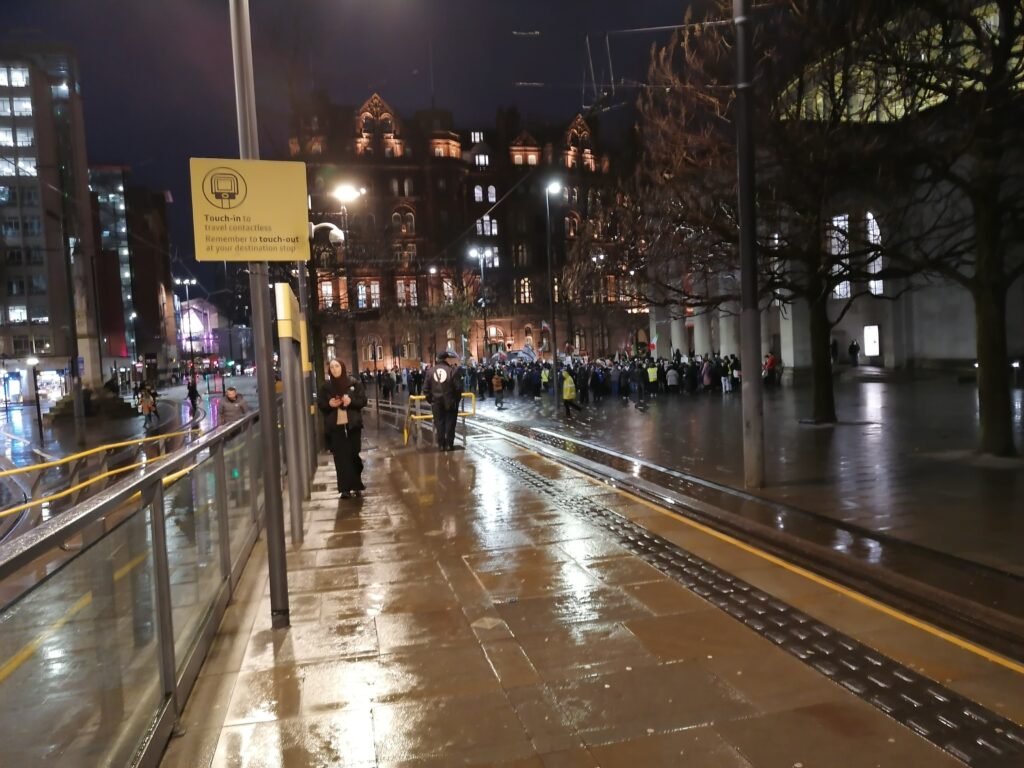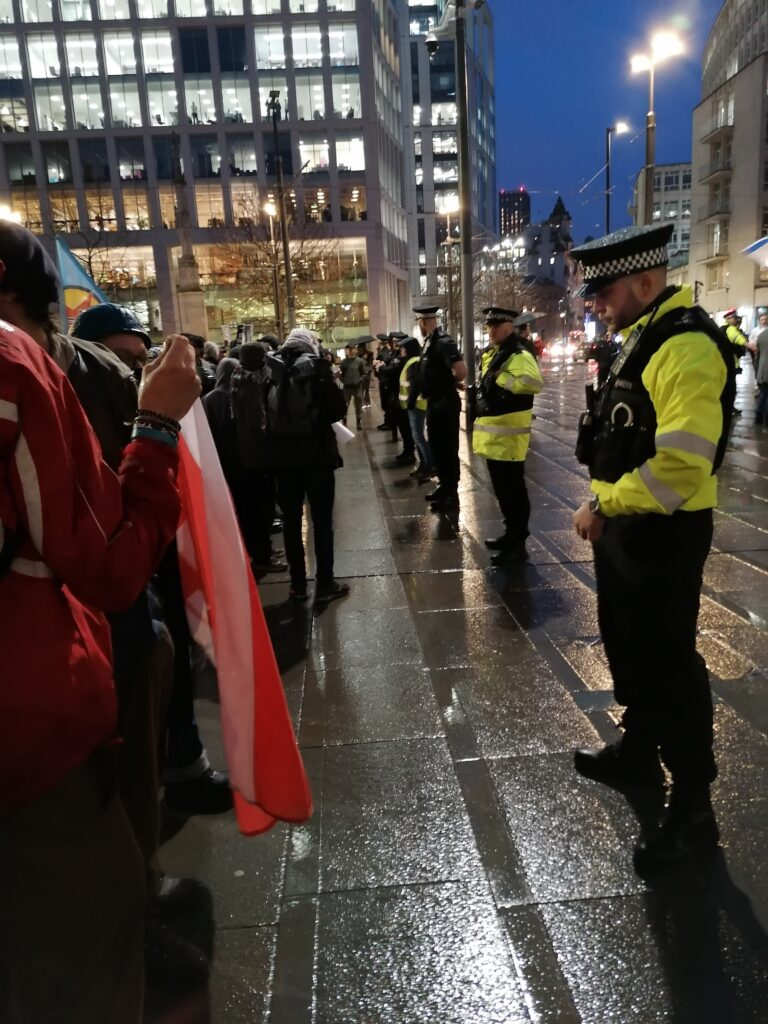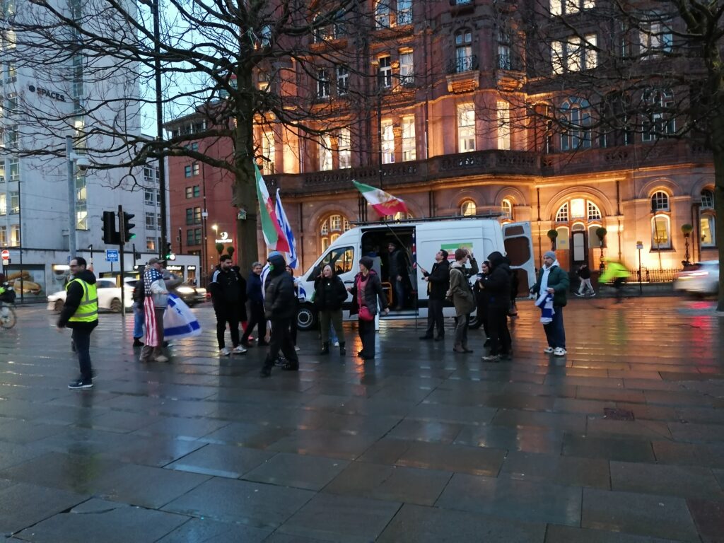A shock in St Peter’s Square in Manchester as about 250 stop the war protesters were confronted by about a 100 Israeli, American and Shah of Iran supporters. There were chants of, U, U, USA as an American flag flew.